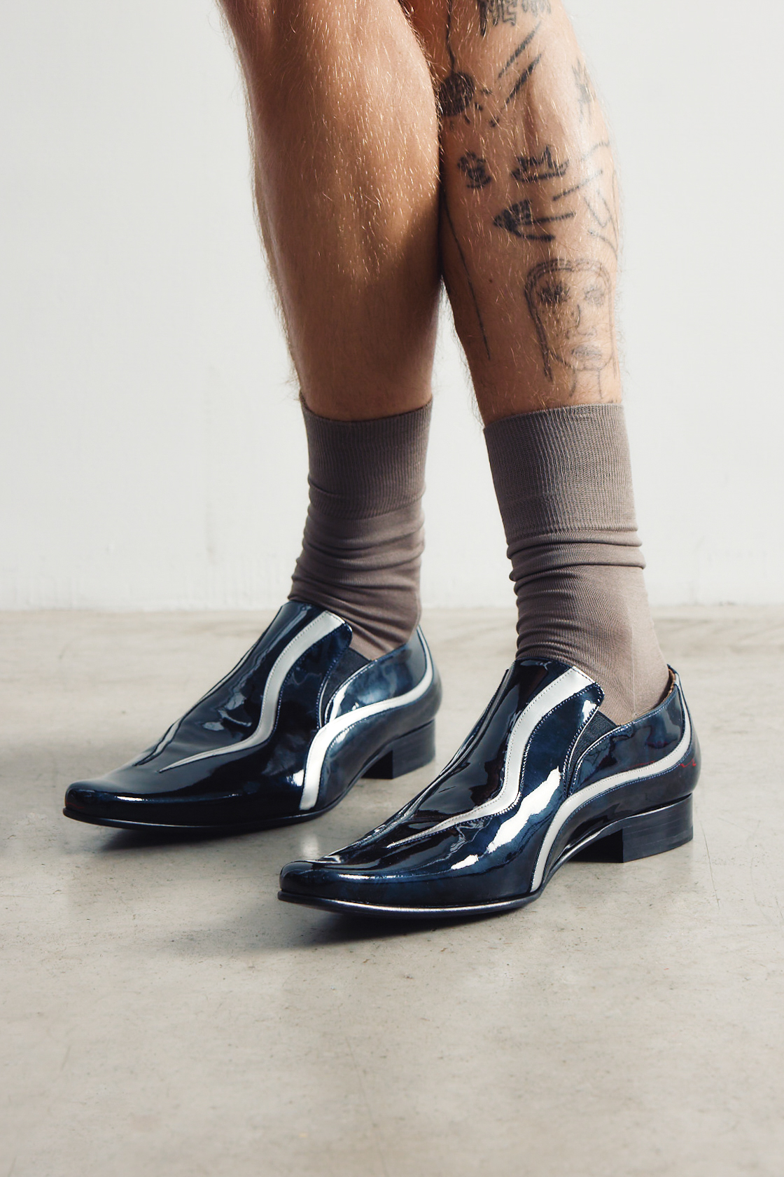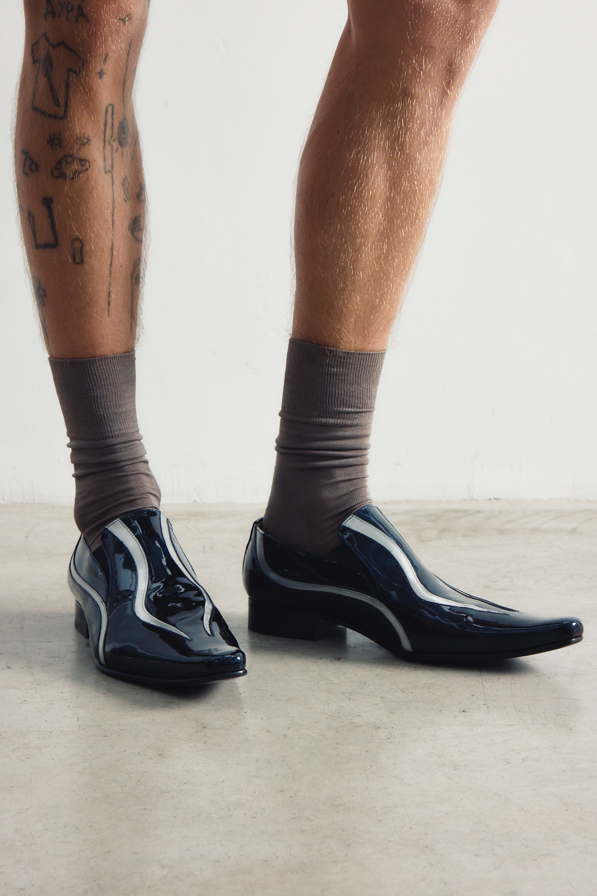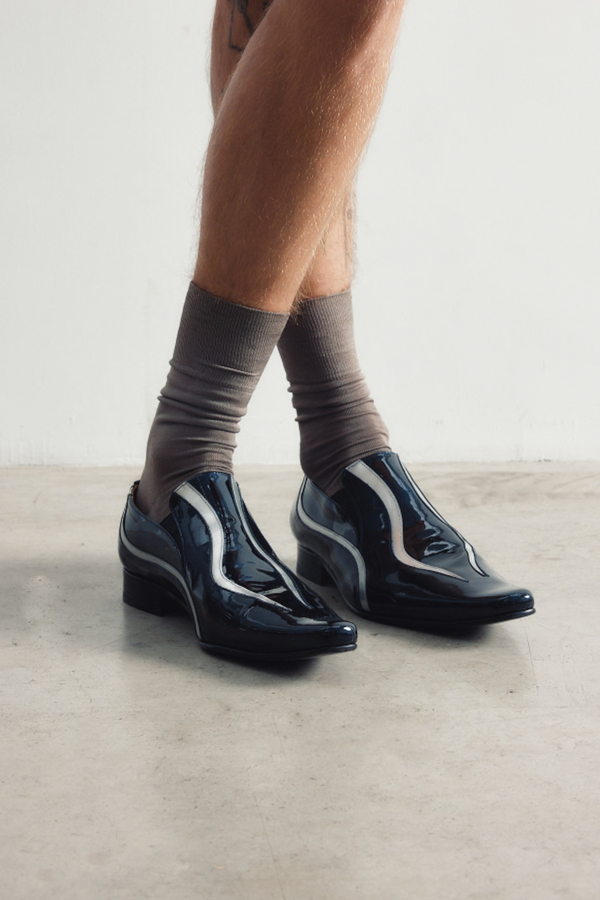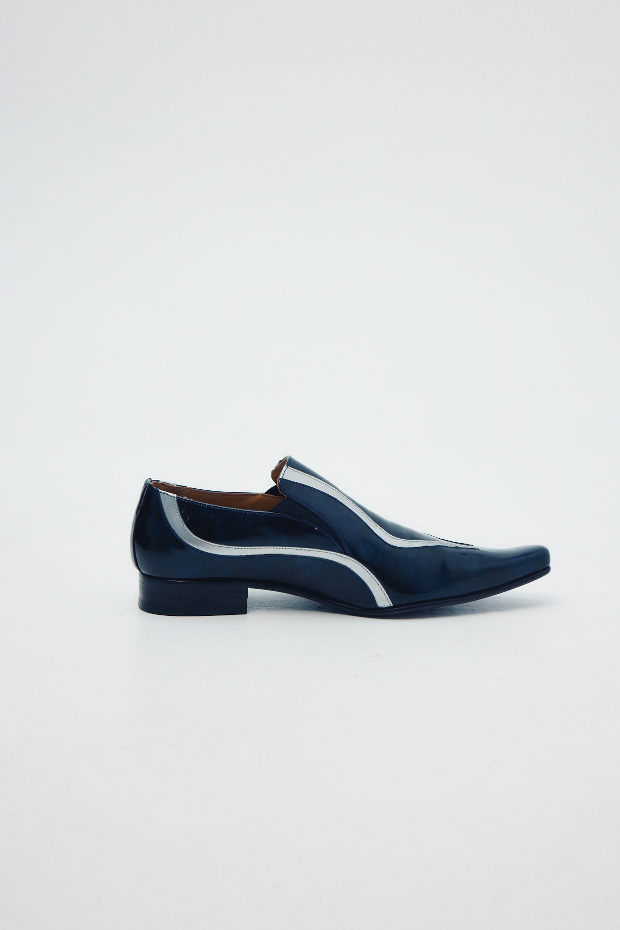 Zapato slip-on de punta alargada con tacón bajo apilado. Hecho en charol azul marino, destacado por franjas plateadas que perfilan la parte superior. Un diseño gráfico y elegante que juega con el contraste entre tonos oscuros y claros.