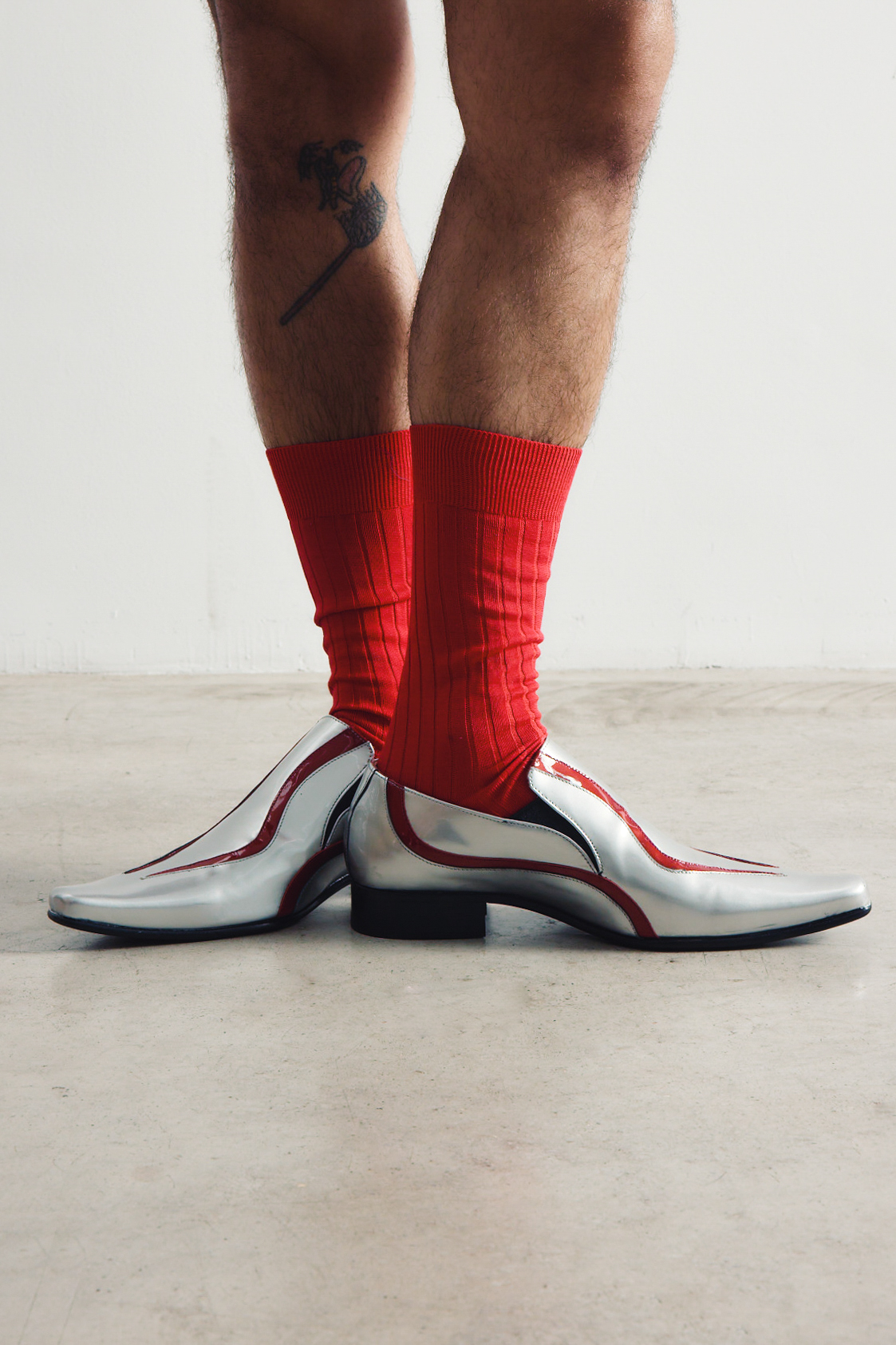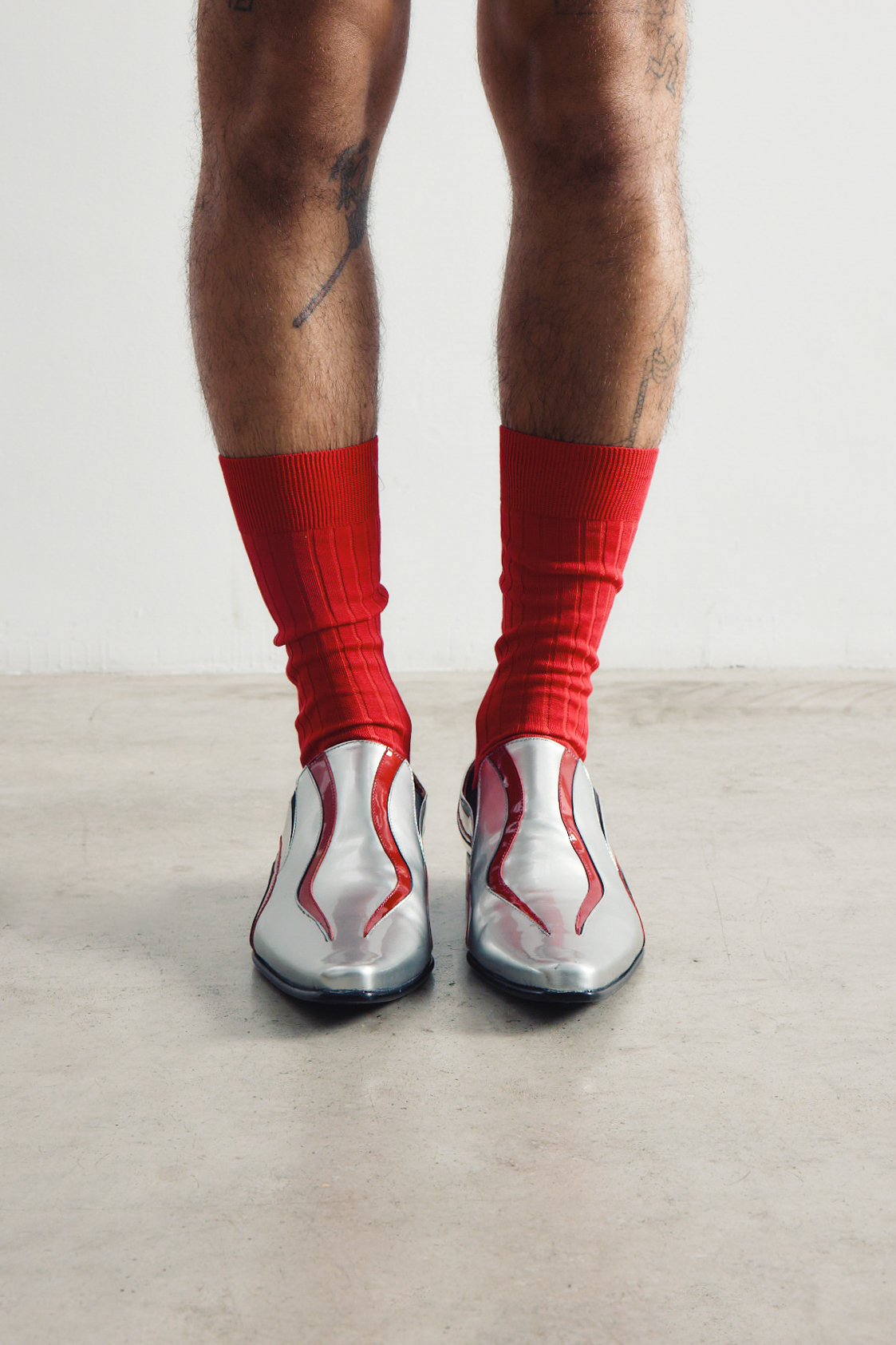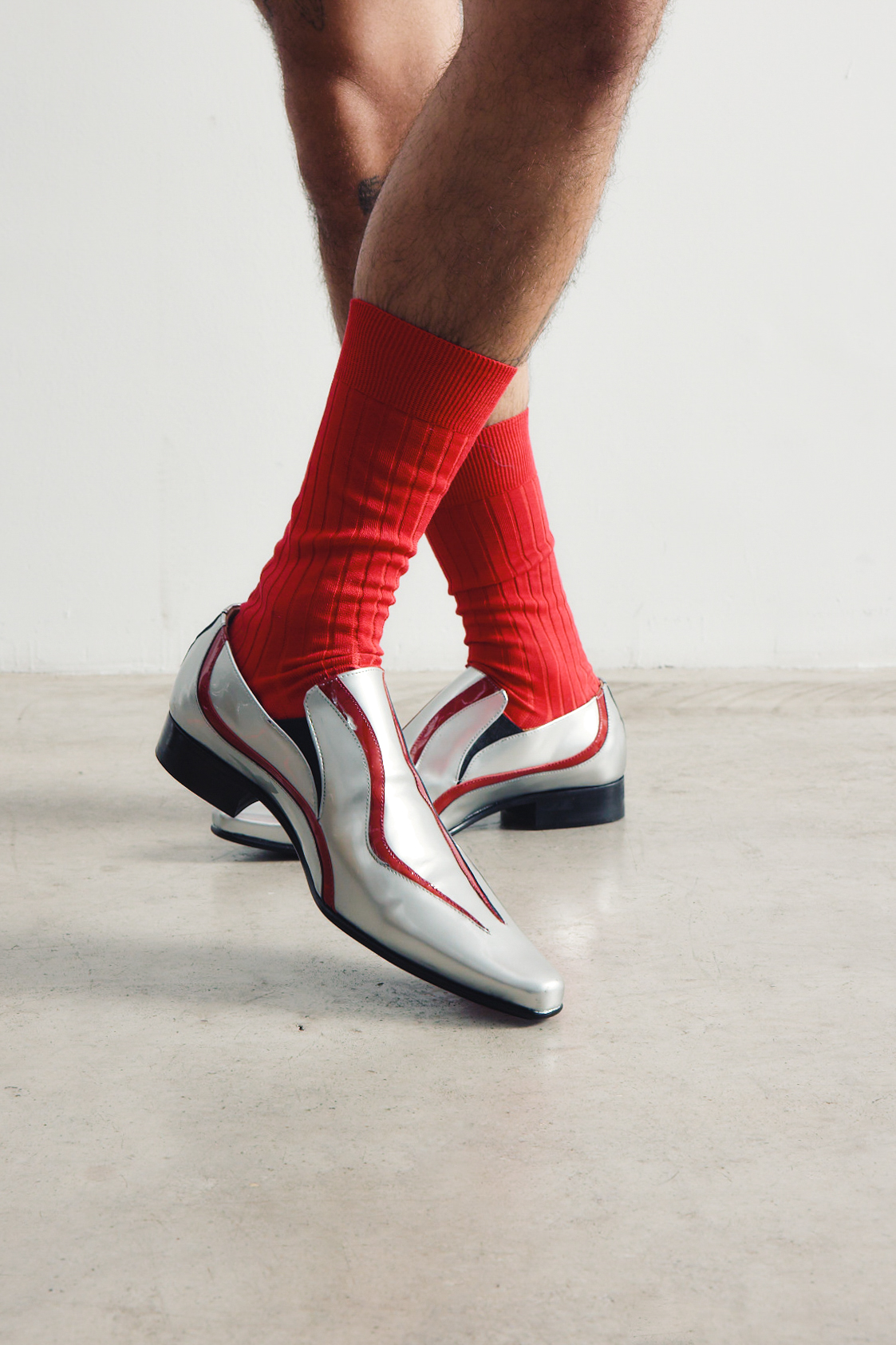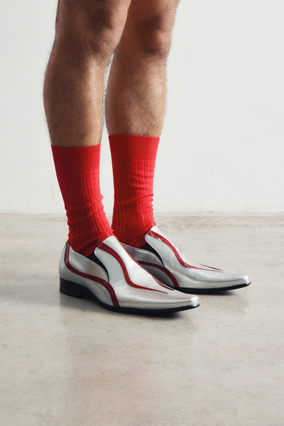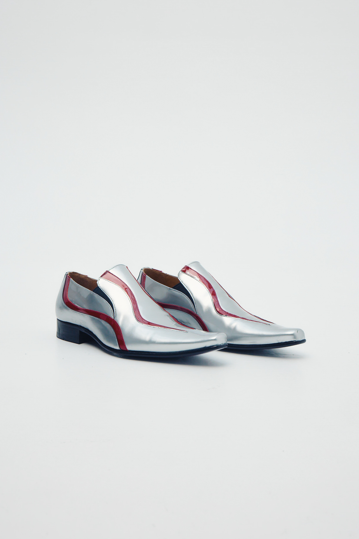 Zapato slip-on de punta alargada con tacón bajo apilado. Confeccionado en piel metalizada plateada, con ribetes rojos que recorren los laterales y el empeine. Una construcción audaz que mezcla destello futurista y líneas clásicas.